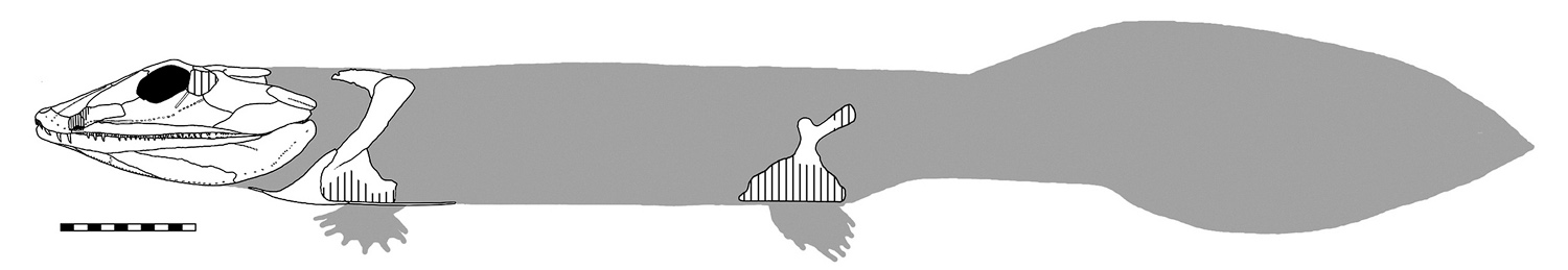 שחזור שלד הוונתסטגה. פר אהלברג, ג'ניפר קלאק ועמיתיהם שחזרו את ראשו, חגורת הכתף וחלק מהאגן של הוונתאסטגה. יתר התמונה מבוסס על אקנתוסטגה. אורך קו קנה המידה: 10 ס"מ. איור: פר אהלברג (Ahlberg), אוניברסיטת אופסלה