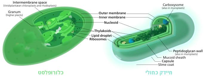 בתאי צמחים ואצות מוצאים, נוסף למיטוכונדריה, עוד מבנים המזכירים חיידקים: הכלורופלסטים. אלו המבנים המאפשרים לצמחים לבצע פוטוסינתזה – המרת אור שמש, פחמן דו-חמצני ומים לסוכרים ולחמצן.