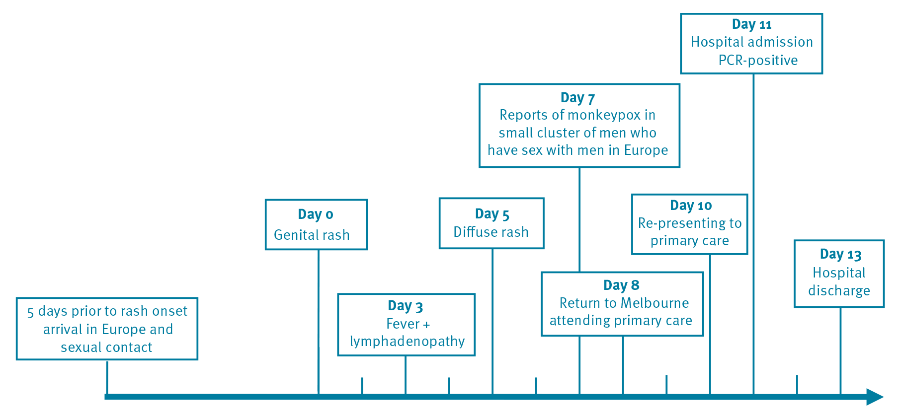 למזלו של החולה, הרופא שמע את הדיווחים בתקשורת על מקבצים של מקרי אבעבועות הקוף אצל גברים סמב"ה באירופה, והחליט לשלוח את המטופל לאשפוז, בגלל חשד לאבעבועות הקוף. האשפוז לא היה בגלל חומרת המחלה, אלא כדי לאפשר אבחון, וטיפול בכאב ובזיהום משני של הנגעים.