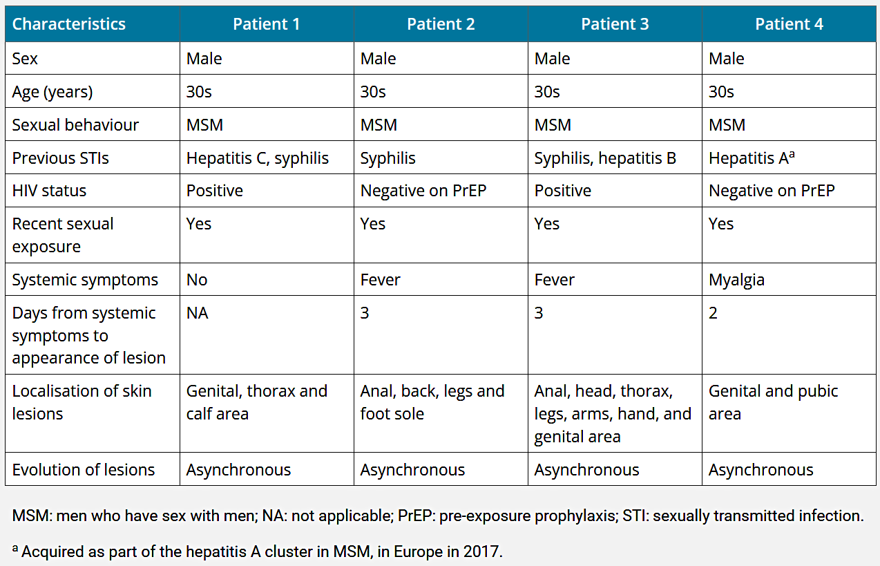 כל 27 החולים בהם התמקד המאמר הם גברים צעירים, וכמעט כולם סמב"ה. 14 מהמקרים חיוביים ל-HIV. רבים מהחולים באבעבועות הקוף דיווחו על קיום יחסי מין עם פרטנרים מרובים במהלך שלושת השבועות שקדמו להופעת התסמינים. התסמינים הנפוצים ביותר היו פריחה, קשריות לימפה נפוחות במפשעה, חום וכיבים באזור איבר המין. שלושה מהחולים נזקקו לאישפוז.