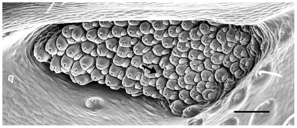 בחזה של החיפושיות, מאחורי הרגליים האמצעיות, יש למלנופילה זוג גומות חישה. בכל גומה יש כ-70 כיפות קטנות, שכל אחת מהן מלאה בנוזל, ובתוכה קולטן רגיש ללחץ (מכנורצפטור) המחובר לתא עצב.