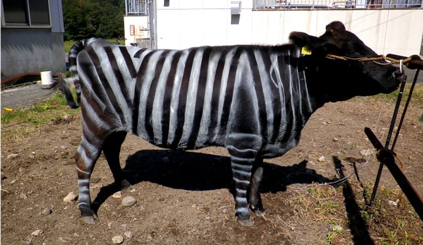 כבר כמה שנים ידוע שהתשובה לשאלה המפורסמת "מי יודע מדוע ולמה לובשת הזברה פיג'מה?" היא "כדי להרחיק זבובים". לפני כמה שנים חוקרים גם הדגימו שאם מלבישים סוסים בתחפושת זברה, זה מקנה להם הגנה מפני זבובים. באותה שנה, 2019, עיטר צוות החוקרים היפני פרות בפסים בשחור ולבן וגילה שמספר הזבובים שנחתו על הפרות המפוספסות בשחור-לבן פחת מאוד, לעומת הפרות האחרות, וכן שתועדו אצלן הרבה פחות תנועות שנועדו לגירוש חרקים.