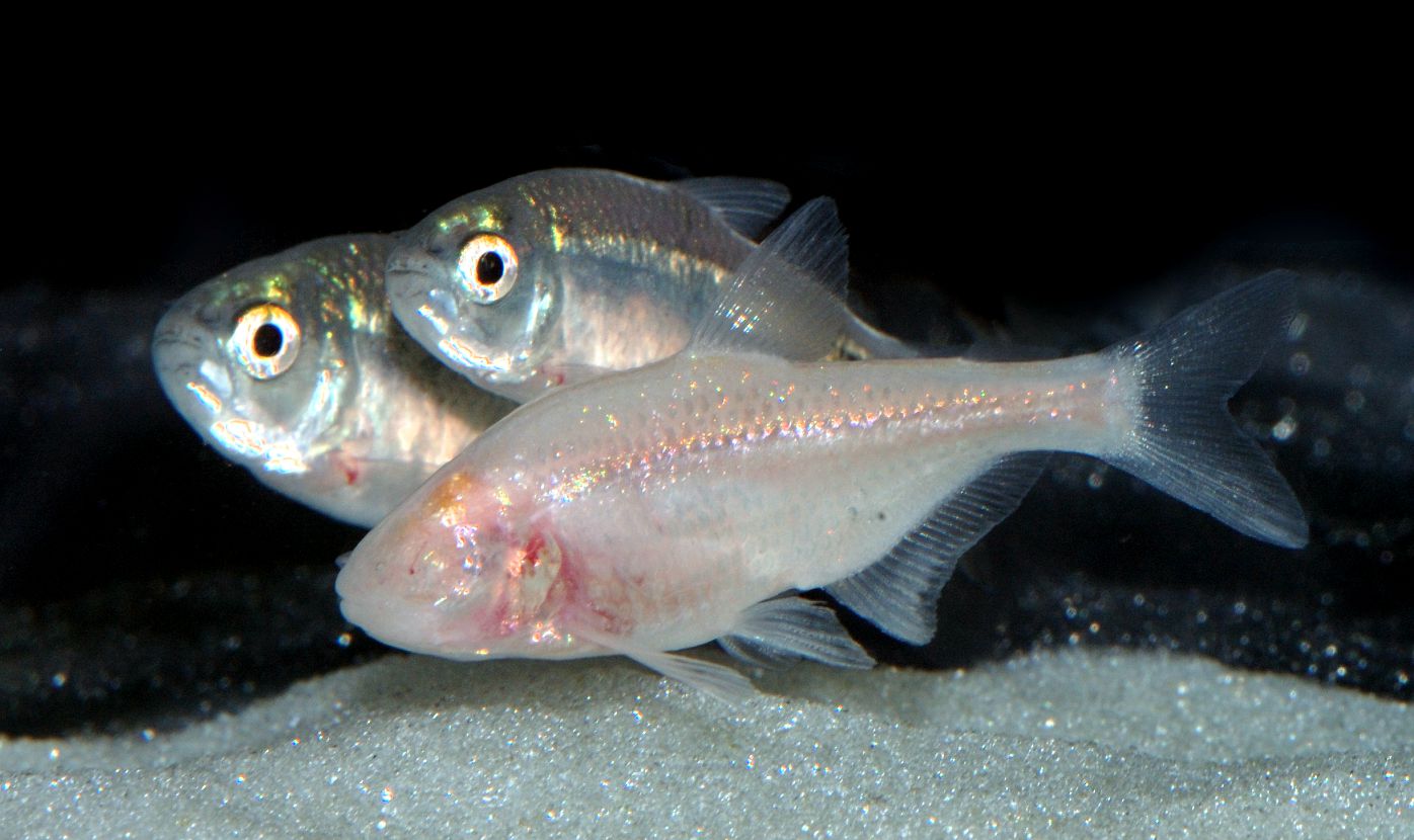 דג מערות עיוור ושני דגים קרובים, החיים בסביבה מוארת ולא איבדו את ראייתם. תצלום: Richard Borowsky, via BioMed Central Ltd.