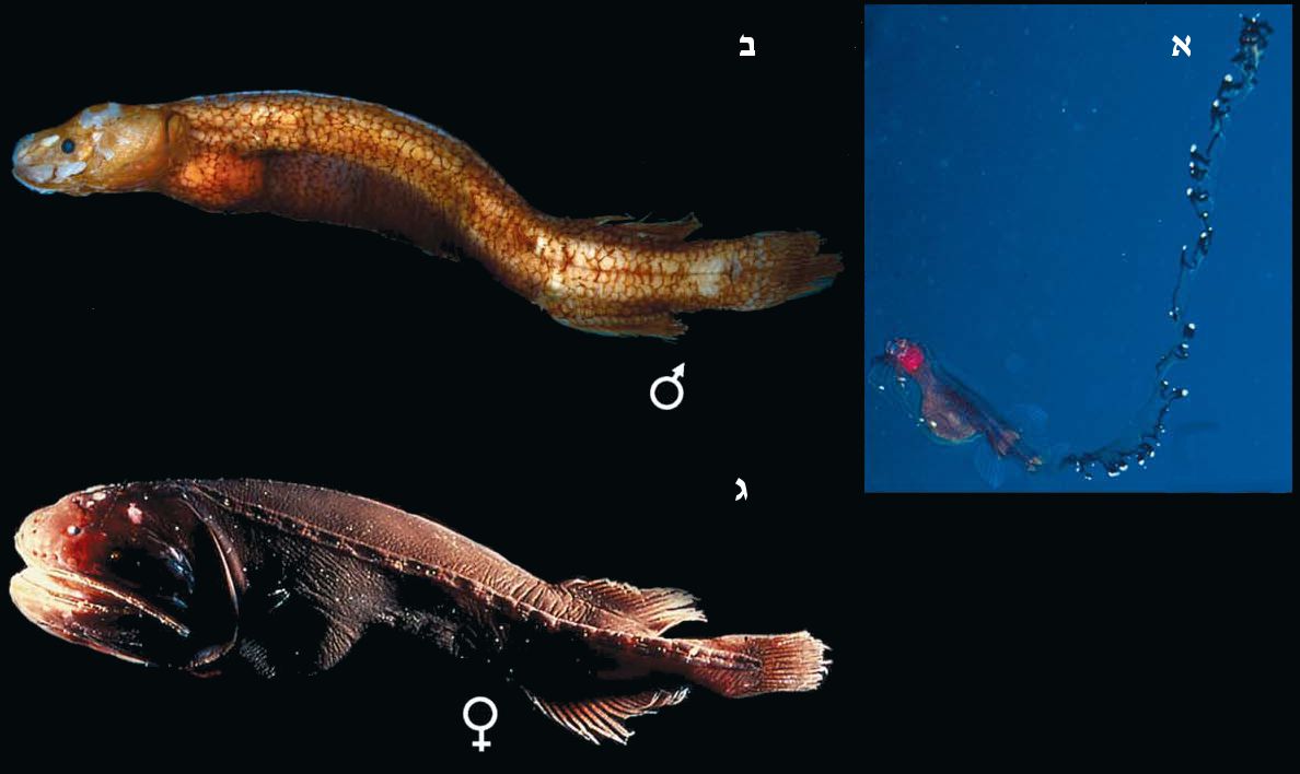 במעמקי הים, בעומק של 1000 מטרים ויותר, קיימות שתי משפחות דגים הנראות שונות לחלוטין זו מזו. משפחה אחת היא של "דגי לווייתן" (Cetomimidae, "דמוי לווייתן") שגופם, כפי ששמם מרמז, מזכיר בצורתו את גוף הלווייתן. כמו לדגי מעמקים רבים עיניהם של דגי הלווייתן קטנות, פיהם גדול והם חסרי קשקשים; כמו כן קו הצד שלהם – שורת איברי חישה לאורך צדי הדג המאפשרים לו לחוש בתנודות במים – מחורץ. כל דגי הלווייתן שנצפו עד כה הן נקבות בוגרות, מעולם לא נמצאו זכרים או צעירים. משפחת דגי העומק השנייה היא של "גדולי חוטם" (Megalomycteridae) – דגים קטנים בעלי קשקשים, פה קטן, עצמות לסת מאוחות וחוטם גדול, שכולם זכרים בוגרים. להמשיך לקרוא שילוש – שלושה שהם אחד